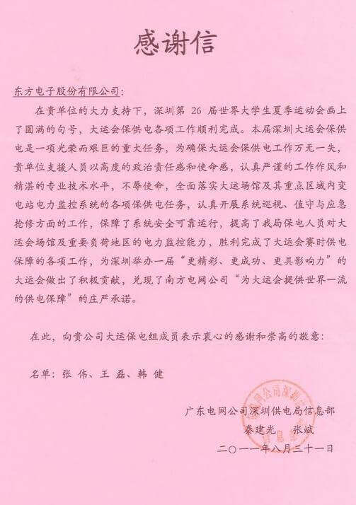 8月23日,世界大学生运动会在深圳圆满落幕,吉林吉利达科技开发有限公司作为大运会唯一保电企业见证了世界大学生体育运动的蓬勃发展。吉林吉利达科技开发有限公司技术中心系统部与工程部坚守“忠于职守,全力以赴,誓保大运电网安全”的信念,联手实现了大运保供电期间系统零故障、零缺陷的目标。